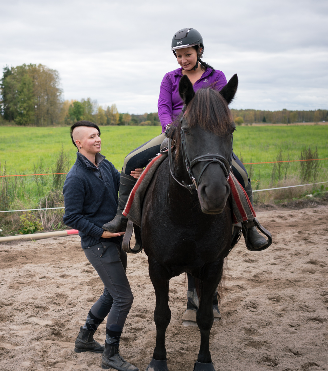 ”Tiedonjanoisen aikuis(täti)ratsastajan näkökulmasta tunneilla saa hyvin perusteltuja ohjeita monipuolista haastetta ja hikeä kaihtamatta! Jo yhden kokeiluluontoisen tunnin jälkeen jäin koukkuun, tiedonjanoa ei ole vielä lähellekään sammutettu. Konkreettiset esimerkit ja mielikuvat helpottavat ainakin itseäni asioiden siirtämisessä teoriasta käytäntöön, lisäksi ne jäävät paremmin mieleen ja uusia asioita voi treenata tuntien välissä itsekseenkin.” -Päivi