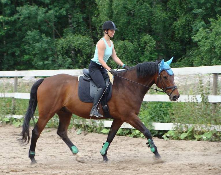 ”Soni osaa katsoa jokaista ratsukkoa yksilöllisesti eikä tuputa jotain yhtä tiettyä ratkaisumallia jokaiseen tilanteeseen. Hän katsoo tarkkaan miten hevonen reagoi, mitkä ovat ratsastajan & hevosen haasteet ja lähtee rakentamaan opetusta sen pohjalta. Välillä tuntuu siltä, ettei ratkaisuvaihtoehdoille ole loppua lainkaan – jos yksi tapa ei sovellu ratsukolle, voidaan aina lähestyä asiaa toisesta suunnasta. Soni on hyvä kuvailemaan ja kertomaan miten ratsastaja käyttää eri apuja ja kehoaan sekä miten tulisi toimia. Hän osaa käyttää havainnollistavia mielikuvia pyytäessään ratsastajaa muuttamaan jotakin toimintatapaansa. Sonin opetuksessa olen ”joutunut” muuttamaan ratsastustapaani merkittävästi ja samalla ratsastamani hevonen on ikään kuin keventynyt ja herkistynyt. Olen itse saanut Sonilta kullanarvoisia vinkkejä ja ohjeistusta mm. laukka-istuntaan ja ”holtittomien” jalkojeni hallintaan. Pieneltä kuulostaneet korjausehdotukset selkeillä ohjeistuksilla ratkaisivat ongelman, jota moni oli yrittänyt korjata. Tästä voinee kiittää myös Sonin ymmärrystä ihmisen kehon toiminnasta ratsastuksen ulkopuolella. Ja onhan se ihan sairaan hyvä tyyppi – hevosetkin tykkäävät! 🙂 ” -Elisa